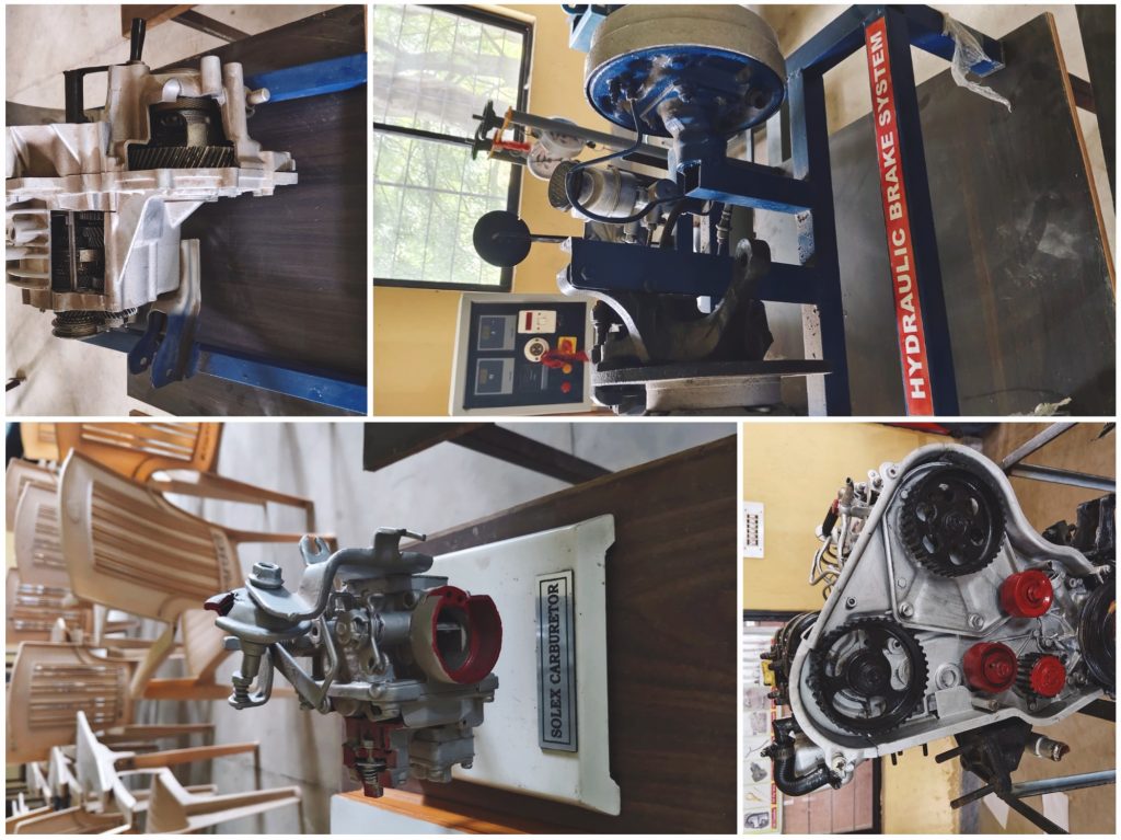 Automotives play a vital role in human life. Basic knowledge of automotive engines and transmission components are essential for a mechanical engineer. The Automobile lab of the department has the major equipment like 4-Stroke Car Engine (100 Cc), Cut Section Of 4- Speed Gear Box, Working Models Of 2-Stroke And 4- Stroke Engines, Hydraulic Braking System etc.