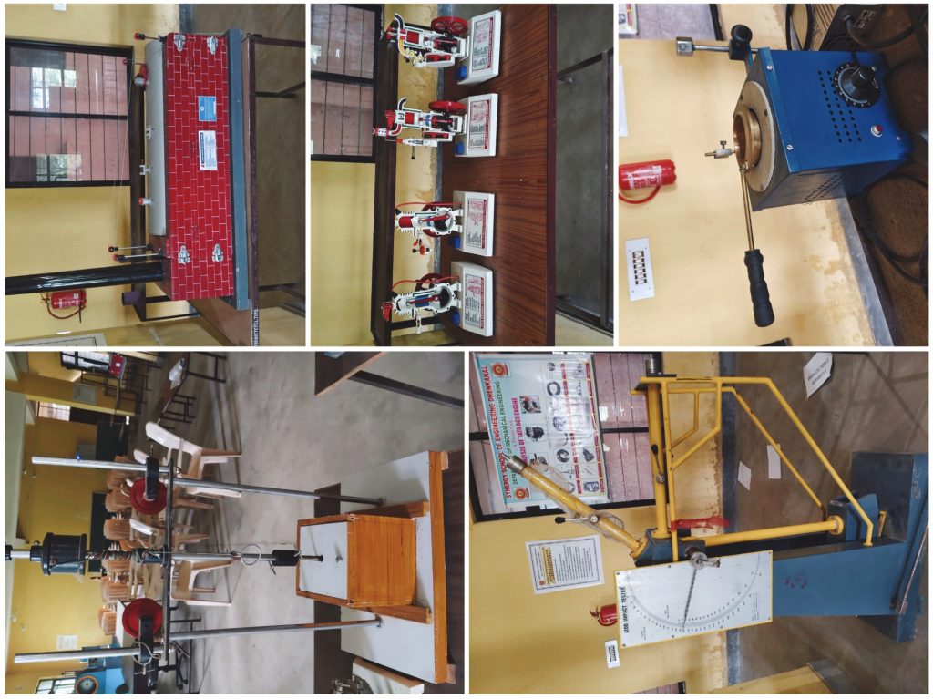 The laboratory is well equiopped with components like Flow Through Pipes Apparatus, Single Cylinder 2-Stroke Petrol Engine Test Rig, Pressure Measuring Devices, Impact Testing Machine, Searle’s Apparatus, Parallel Force Apparatus etc.